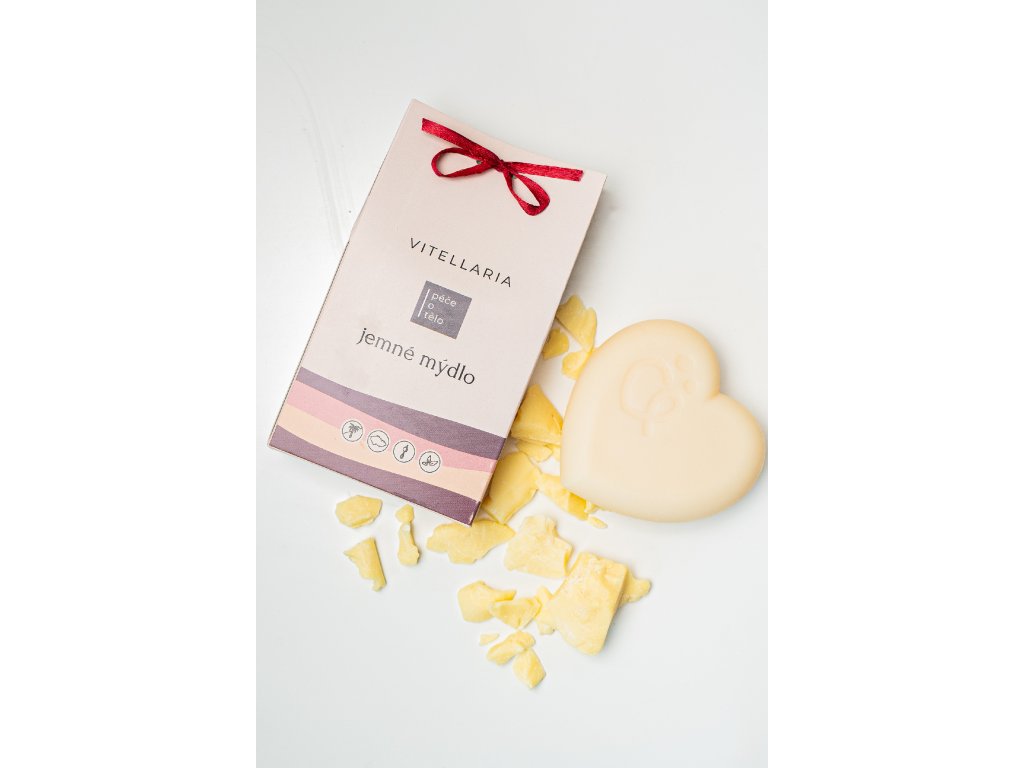 Jemné mýdlo je záměrně bez barviv a parfemace, aby vyhovovalo i té nejcitlivější pokožce.