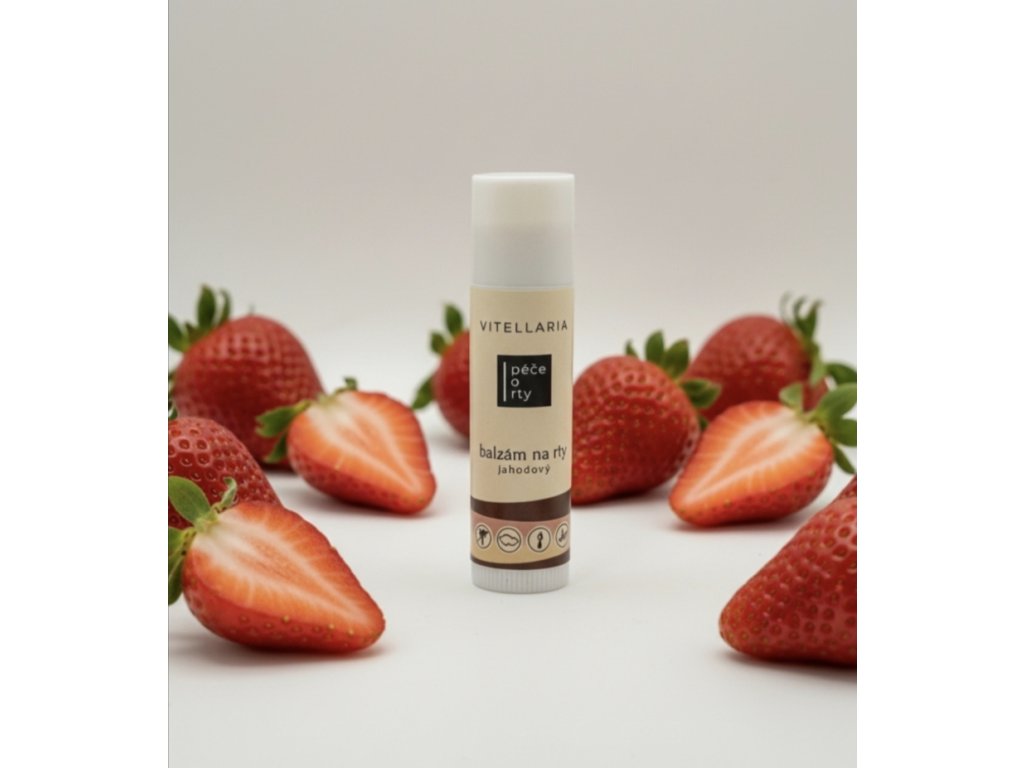 Výživný balzám na rty s lyofilizovanými jahodami.