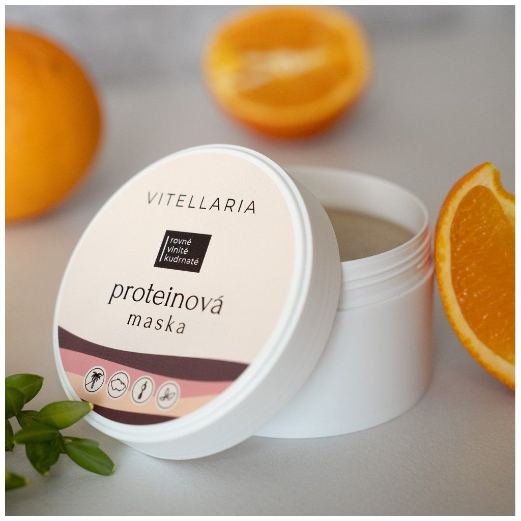 Proteiny nabitá přírodní maska vlasy vyživuje, obnovuje jejich pružnost a podporuje růst vlasů. Je obzvlášť vhodná pro lámavé a poškozené vlasy. Proteiny podporují vlnění vlasů, ale maska je vhodná i pro rovné vlasy. Vůně je citrusovo bylinná, oblíbená kombinace pomeranče a rozmarýnu.