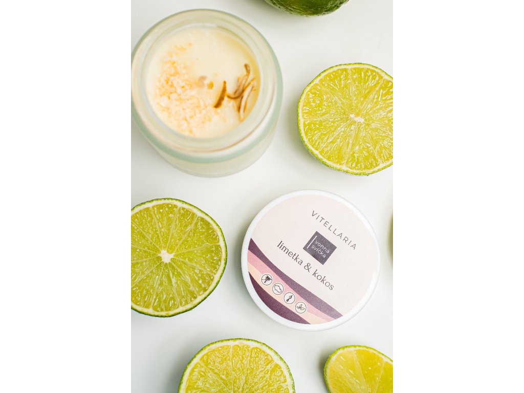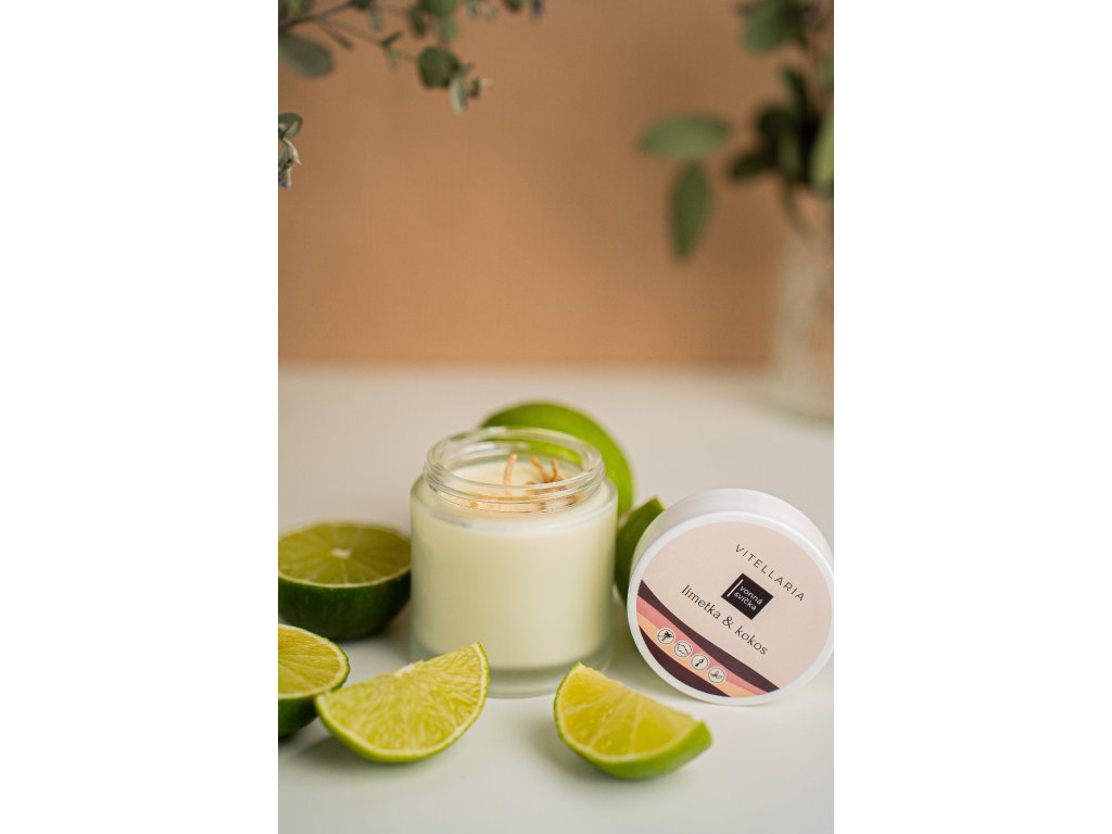 Přírodní vonná svíčka ze sójového vosku a kokosového oleje, s exotickou vůní kokosu a limetky.
