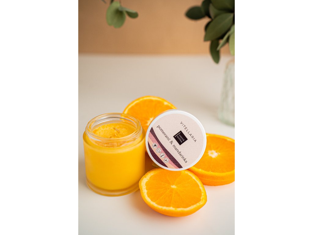 Přírodní vonná svíčka ze sojového vosku a kokosového oleje, s úžasnou nejen vánoční vůně pomeranče a skořice.